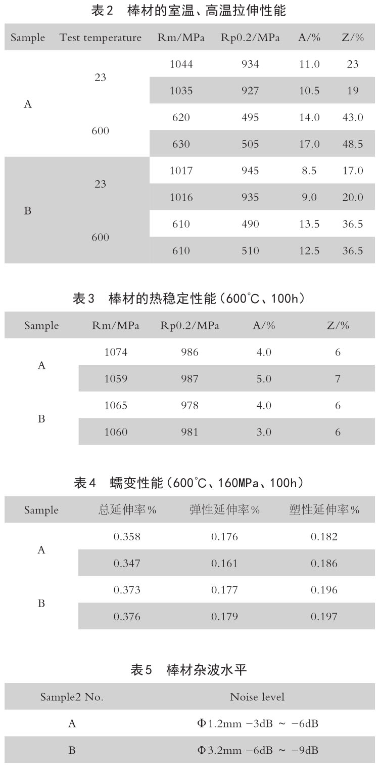表2 ~ 3为两种工艺所生产棒材R/2处弦向的室温、高温拉伸及热稳定性能。由测试结果可以看出方案A各项性能指标均优于方案B。