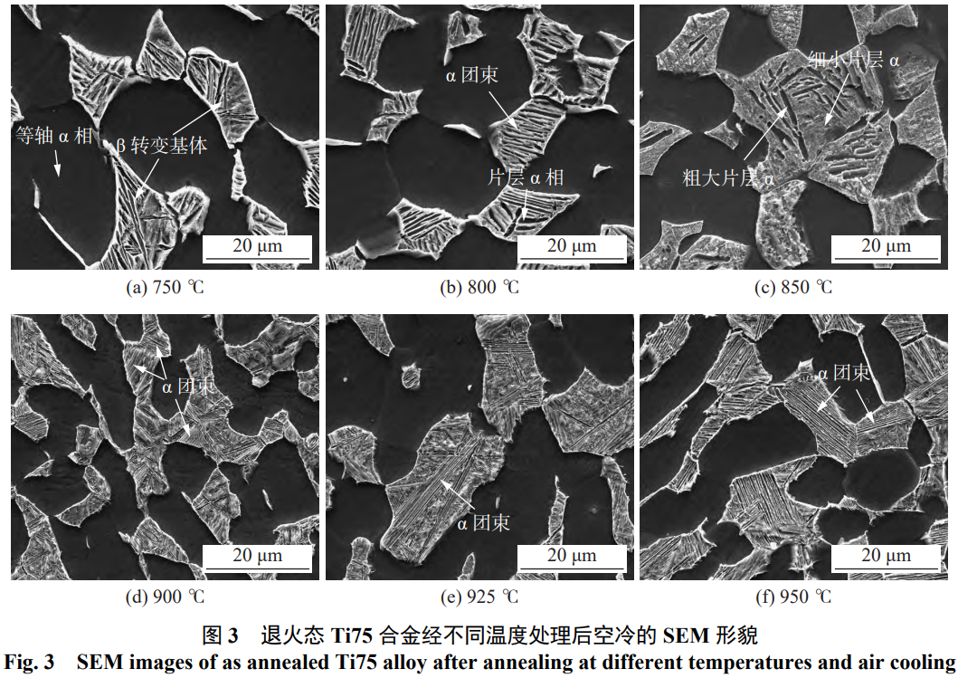 图2、3为退火态Ti75合金经不同温度处理后空冷的显微组织。采用ImageJ软件对光学金相组织中等轴α相的体积分数进行统计,结果如图4所示。750℃温度较低,α相向β相转变动力不足,显微组织由等轴α相和β转变组织构成,见图3(a),等轴α相体积分数约为55%。温度升至800℃,片层α相厚度增至最大约为1.0μm,长宽比降低,如图3(b)。850℃保温处理时,大量较小的片层α相溶解,发生α相→β相转变,在随后的空冷过程中高温β相析出细小α相。尺寸较大的片层α相则因转变动力不足无法发生相变而保留下来[12],并有所长大。冷却至室温后,β基体上分布有大量的细小α相与少量长宽比较小的粗大片层α相,如图3(c)所示。900~950℃时,进入α+β两相区,α相向β相转变的驱动力足够大,原始β转变组织内的片层α相完全溶解,等轴α相部分溶解且晶粒尺寸减小,如图2(d)~(f)。随着后处理温度不断接近β转变温度,等轴α相溶解的驱动力增大,其体积分数随着后处理温度的升高而逐渐降低至45%;β转变组织体积分数、α集束尺寸则逐渐增大,且未发现与图3(c)类似的粗大片层α相。在该温度区间,片层α相的厚度随后处理温度升高而逐渐增大,如图3(d)~(f)所示,但由于试验用热处理试块尺寸远小于原大规格锻件,冷却速率较快,故片层α相厚度仍小于退火态。