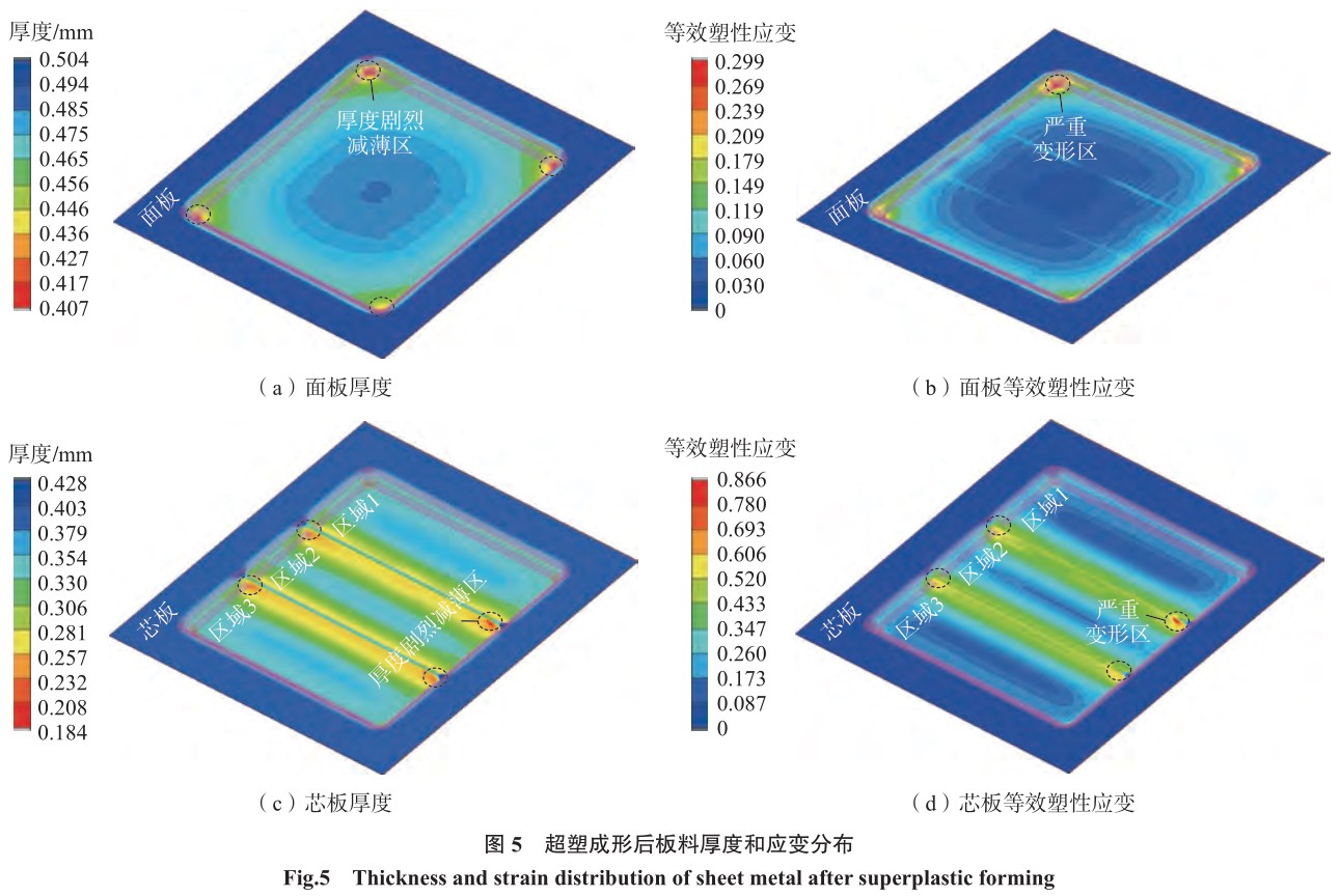 图5(a)为面板在胀形后得到 的厚度仿真结果,可以明显看出,面 板胀形结束后,板料在4个圆角减 薄最为严重,减薄率达到了18.6%。 面板的中心区域减薄较小,这是因 为该区域最先贴模,坯料与模具之 间的摩擦力抑制了该区的金属向其 他区域补充。如图5(b)所示,面 板胀形的等效塑性应变分布很好地 印证了图5(a)所示的厚度减薄特 征。图5(c)和(d)分别为芯板超 塑成形后的厚度变化及等效塑性应 变云图,可知,区域1和区域3先于 区域2贴模,且圆角区域减薄极为 严重。
