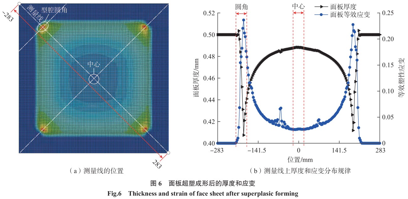 为定量研究面板超塑成形后的 厚度和应变演变规律,通过图6(a) 所示的测量线进行数据图提取。图 6(b)为测量线上厚度、等效应变数 值,显然在压边圈覆盖区域的面板厚 度基本不变,从压边区至圆角处厚度 迅速下降,而应变值的显著提升也证 明在圆角处变形量极大。从圆角到 面板中心,厚度逐渐增加至峰值,应 变值的分布规律正好与之相反。
