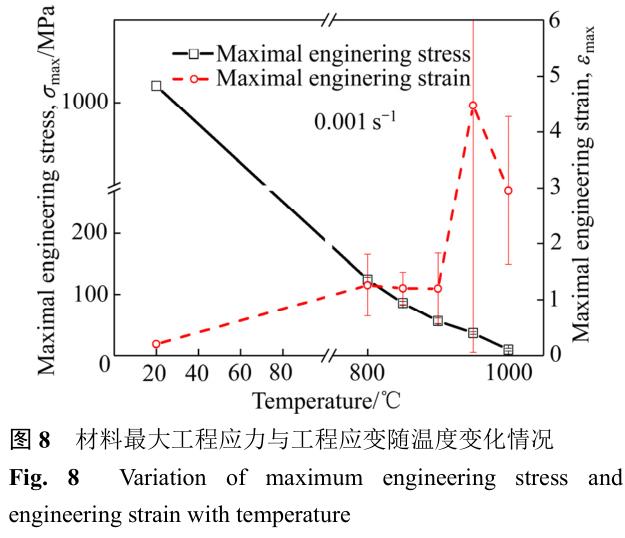 当热电偶安装在均匀变形区时,一旦试样发生颈缩,由于颈缩区域的横截面积迅速缩小,该区电阻和电流密度迅速增大,其温度很快高于均匀变形区(测量点)的温度,加速了破坏的进行,试样的最终整体变形量较小,而且由于断口处组织温度超过实际设定,也会导致最终断口处组织出现 β 转变体;当热电偶位于断裂位置时,颈缩破坏在指定的温度下持续进行,试样的最终整体变形量较大。图 8 所示为在 0.001 s−1 应变速率下拉伸试样的最大工程应力与最大工程应变随温度升高的变化情况,可以看出由于热电偶安装位置与试样发生颈缩破坏位置的不一致,材料破坏时测得的变形量相较于屈服强度的有较大的分散性,工程应变偏差范围在 0.29 到 4.42 之间。
