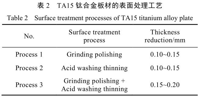 为使退火后的TA15钛合金板材获得具有金属光泽的表面,分别采用研磨抛光(工艺1)、酸洗减薄(工艺2)、研磨抛光+酸洗减薄(工艺3)3种表面处理工艺去除表面氧化层,研磨抛光方向平行于板材轧制方向(RD)。其中,研磨抛光所用砂轮为80#~320#SiC砂轮,酸洗减薄所用酸液为HNO3+HF+H2O混合溶液,浸泡时间为0.5~5min,具体工艺见表2。