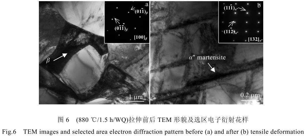 图5为TC6合金经过不同固溶温度处理后的工程应力-应变曲线及拉伸性能,在800~840℃固溶处理后,总体上合金的强度和塑性随着温度升高稍微增加,从显微组织和相组成上可知,合金发生了回复和再结晶,虽然晶粒尺寸随着温度升高长大,但显微组织和元素分配更均匀,因此综合性能有所提高;固溶温度升高到880℃,如工程应力-应变曲线所示(图5a),此时拉伸曲线上存在双屈服现象,由于屈服强度取第1个屈服点,因此屈服强度明显降低,随固溶温度升高,亚稳β相含量增加。因此,β基体中的β稳定化元素含量降低,β相稳定性变差,从拉伸前后TEM形貌和选取电子衍射结果看(图6),拉伸后β相中有大量的斜方马氏体α″相存在。由此可知,在拉伸变形的初期,部分亚稳β相应力诱变为α″相[11-13],马氏体相变为主导的塑性变形,产生第1个较低的屈服点,随着α″相含量的增加,马氏体相变所需应力超过α和β相的屈服应力,位错滑移为主导的塑性变形,产生第2个屈服点;当920℃固溶处理后,同样产生双屈服现象,此时β相稳定性变得更差,亚稳β相更容易应力诱变α″相,同时由于β相中本身存在大量的弥散细针状α″相,导致第1个屈服点更低,另外,大量的α″相引起明显的弥散强化,合金的抗拉强度明显提高,此时组织中保留了一定量的初生α相(图3d),等轴初生α相可以改善合金的塑性[14,15],故塑性降低不明显;随温度继续升高到960℃(接近β转变点),α″相弥散强化效果继续增加,但初生α相基本消失,因此塑性明显降低,拉伸试样发生脆断;当合金在超过相变点温度处理后(1000℃),原始粗大的β相及水冷形成的粗大针状α'相导致合金抗拉强度下降,拉伸为脆性断裂。