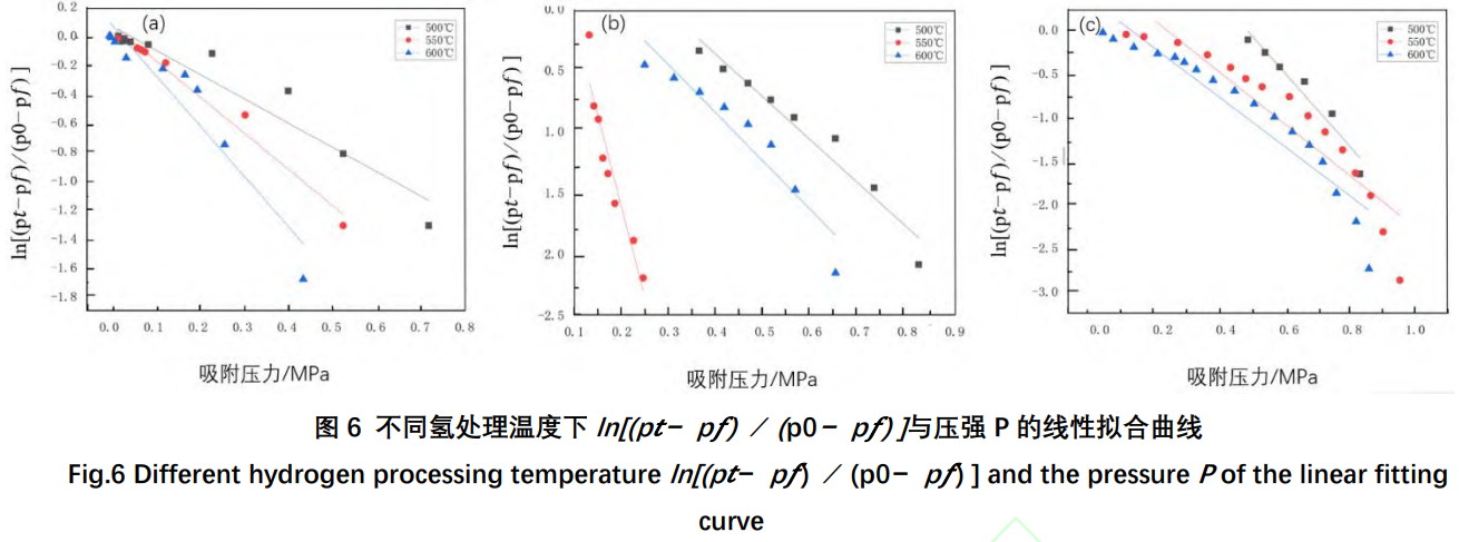 上式中,p0指实验前,材料所处环境下的起始压力;pt代表随着时间变化时,在任一时刻t的氢压;pf指完成整个反应后,达到动态平衡时的系统压力,kα表示钛合金吸氢反应的反应速率常数。
