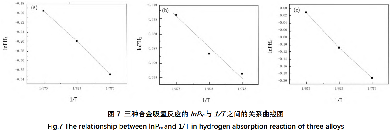 上式中,ΔH指系统内氢化物的焓变量;ΔS指系统内氢化物的熵变量;R指气体常数量;PH2为系统内当氢气达到压力平衡时的值;T指系统内温度值。结合公式(3),可以得到吸氢反应速率常数的自然对数值lnPH2与氢处理温度的倒数1/T之间的关系。从图7可以看出,lnPH2与反应环境所处温度T之间存在着良好的线性关系。