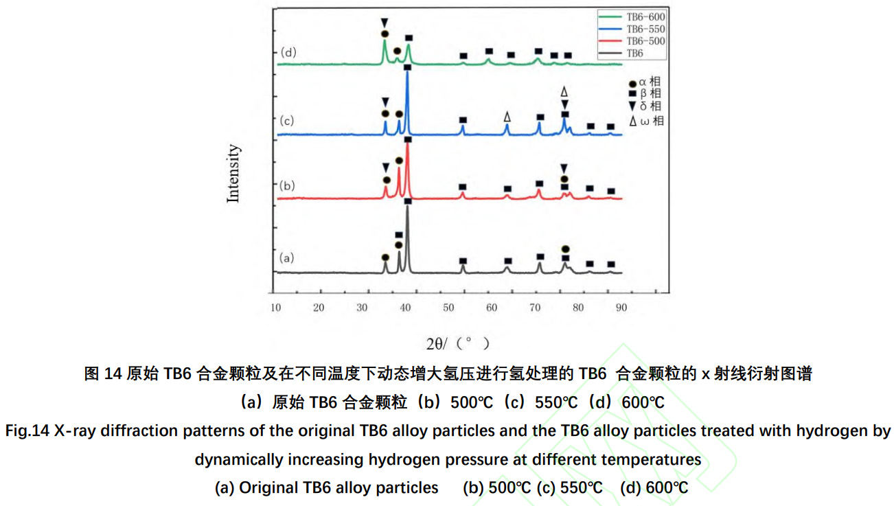 由图14可看出,对比图14中谱线(a)、(b),合金组织中β相的衍射峰值减弱,α相峰值增强;但在谱线(c)中,即经550℃热氢处理后的衍射图谱可看到出现了β相峰值增高、α相峰值减弱的情况。这表明在一定温度范围内,随加氢温度的增高,合金组织中的β相的含量会先减少后逐渐增加的过程,而α相与β相正相反,其含量会先增加后减少,与微观显微组织的变化一致,即当氢处理温度为550℃时,达到转换的动态平衡,黑色物质较为均匀地分布,造成这一现象的原因是当愈多的氢元素进入到合金内部,高温时由于氢的加入既能促进合金组织中α相向β相的转变,也能一定程度上降低合金的临界冷却速率[35]。第一组氢处理实验中加氢温度为500℃,此时的温度不能使合金达到临界冷却速度,所以β相稳定性不是很高,易发生相变,部分β相共析转变为α相和δ相,其中α相占大部分,但当加氢温度达到550℃时,由于氢的作用会令临界冷却速率降低至实验条件下的冷却速率,从而使更多的β相保留下来。β相的衍射峰发生了向低角度偏移的现象,此现象的产生同TC4峰偏移的现象大致相同,也是因为温度的增加令更多的氢进入到合金内部,继而使得β相的晶格常数增大,布拉格衍射角减小造成的。热氢处理后的TB6合金粉末内部还出现了结构为面心立方结构的δ氢化物,其部分峰与α相是重叠的,这就造成了部分衍射峰的宽化现象。此外在谱线(c)的图谱中还发现了ω亚稳相,此种相往往与β相共生存在,但其尺寸却不如β相[36],它的存在与会扩大上述两种图谱变化的差异性现象。