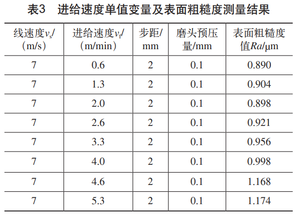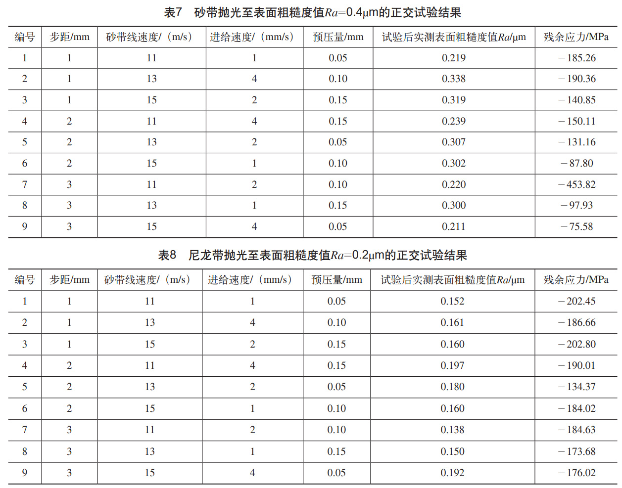 因选取的参数是离散化数值,故存在一定的差异性,综合加工质量和效率分析认为,后期工程应用的参数选择范围为:线速度9m/s以上;在保证效率的情况下,精抛尽量选择较低进给速度;磨头预压量取0.10~0.20mm;步距取1.0~3.0mm。同时,须注意各参数的耦合作用,如当选择较大砂带线速度、较低进给速度和一定预压量时,加工后表面质量不一定好;又如在磨削压力一定的情况下,选择较小的线速度、进给速度,也可得到较小的表面粗糙度值。
