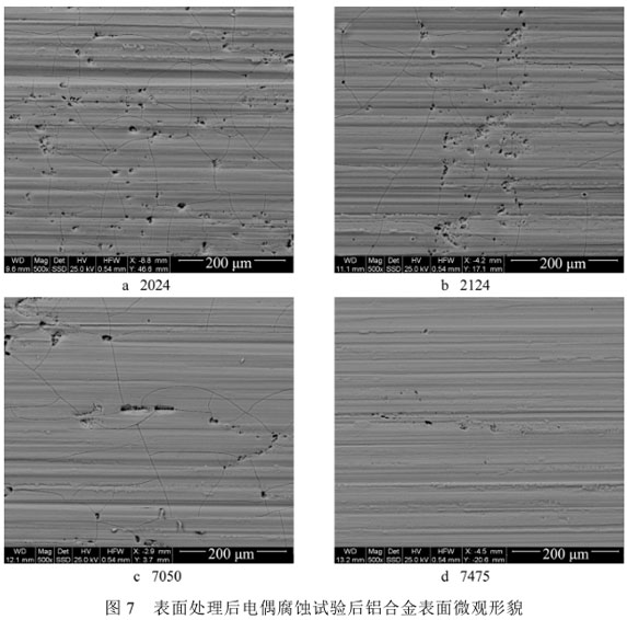 与 TC4钛合金厚板发生电偶腐蚀后 2024,2124,7050,7475 铝合金表面微观形貌如图 3 所示。由图 3 可知,电偶腐蚀后 2024,2124,7050,7475 铝合金表面均发生了不同程度的腐蚀现象,腐蚀形式以点蚀为主。结合图 2 曲线分析,铝合金2024,2124,7050,7475 均不能与钛合金 TC4钛合金厚板直接接触使用。