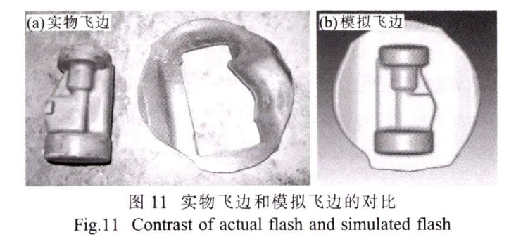锻后锻件的填充性与表面质量优良。实际锻造飞边与数值模拟飞边对比如图11所示,二者外观轮廓形状一致,表明模拟的金属流动与实际锻造过程中金属的流动情况一致,充分说明了数值模拟的准确性。