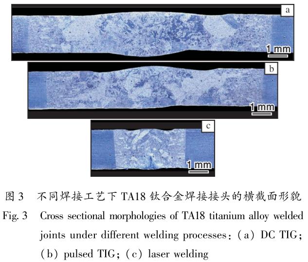 随着钛焊管制备技术的发展,相比无缝钛管,钛焊管在制造成本、绿色高效、壁厚均匀一致性等方面显示出一定的优势,并已在某些领域取代无缝钛管获得应用[8]。然而,现阶段针对TA18钛合金焊管的研究较少,尤其是焊缝对服役性能的影响有待深入研究。因此,分别采用钛焊管工业生产中常用的直流钨极氩弧焊(直流TiG)、脉冲钨极氩弧焊(脉冲TiG)和激光焊接工艺对TA18钛合金板材进行焊接,研究不同焊接工艺对焊缝几何形状、显微组织及力学性能的影响,以期为TA18钛合金焊管的研发提供一定的理论依据和技术参考,推 进钛合金焊管的生产应用。