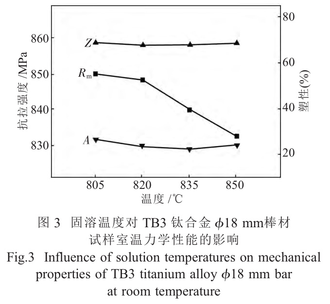 图3为固溶温度对φ18mmTB3钛合金棒材试样室温力学性能的影响。由图可见,对于强度指标,当固溶温度小于820℃,抗拉强度下降缓慢;当固溶温度大于820℃时,随着固溶温度的升高抗拉强度迅速下降。抗拉强度随固溶温度变化的趋势与图2中平均晶粒尺寸随固溶温度变化的趋势相反,抗拉强度随固溶温度升高而下降的幅度几乎相近于平均晶粒尺寸随固溶温度升高而增大的幅度。由于完全固溶态不存在位错、第二相质点等影响室温强度的因素,固溶态TB3钛合金棒材室温强化机制主要为细晶强化,室温强度主要受晶粒尺寸影响,晶粒尺寸越小,强度越高。图中固溶温度对于塑性指标的影响幅度较小,说明晶粒尺寸对于固溶态TB3钛合金棒材室温塑性影响较小。