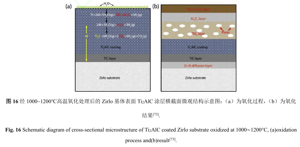如图16a所示,Ti2AlC涂层在高温水蒸气环境下迅速遭受破坏和氧化,形成R-TiO2和α-Al2O3的氧化层,随后,Ti2AlC相中的Ti-Al键在热驱动下优先断裂,和Al同时作用于涂层表面和基体上。由于结构中Al和Ti之间的结合能较弱,Al原子很容易从涂层内部扩散到表层,留下Ti2C层。Al和Ti2C分别进入涂层内部与蒸汽发生反应,形成α-Al2O3层和多孔R-TiO2层(其中TiO2层中形成的孔隙主要是由于反应过程中生成的CO2和H2所致),这一氧化过程主要受热驱动下的Al扩散控制。最终氧化结果如图16b所示。