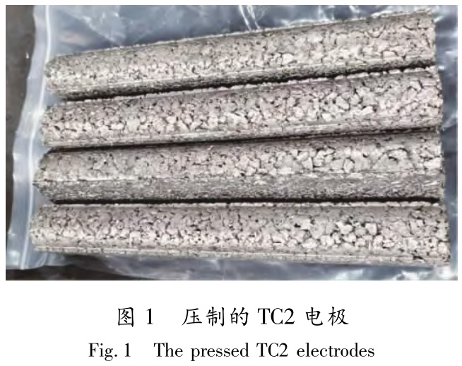 将海绵钛、Al丝和金属Mn按照配入比例进行均匀混合后倒入一定形状的模具中,用1000t以下的油压机压制成φ40mm的电极棒(质量为1.25kg),共需压制4支电极,以便后续一次真空自耗制成2支一次锭。压制的电极实物如图1所示。