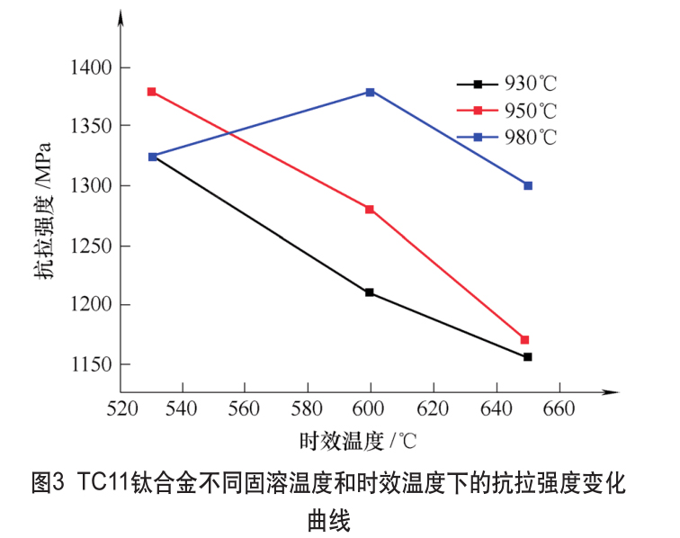 3.2 不同固溶、时效工艺制度对TC11组织性能影响