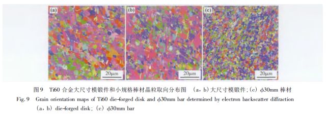 研究表明,Ti60 合金中允许析出α2相,固溶时效处理后,α2相主要存在于初生α 相(αp) 内,高温长时热暴露后,初生α 相和α 片层中均会析出大量α2相[58]。α2相析出使合金中可动滑移系减少,位错切过α2相会促进平面滑移,使变形高度局域化[58]。局域化程度取决于滑移长度[59],滑移长度取决于“有效晶粒”尺寸。“有效晶粒”尺寸大,滑移系一旦启动就会穿过整个晶粒,因此滑移长度10也大,滑移局域化也越明显,这是600℃钛合金粗晶组织热稳定性差,需要采用双态组织的原因。“有效晶粒”相当于微织构[60 ~ 63]造成的“有效结构单元(effective structural units)”[64],也称为“宏区(macrozone)”[62],由某一区域内晶体位向接近的晶粒组成。在存在微织构的情况下,已经启动的平面滑移很容易从一个晶粒进入取向相近的另一个晶粒而不必启动新的滑移系。因此从工艺控制上,获得细小、晶粒间取向差大的显微组织有利于缩短滑移长度、增加滑移带密度,改善变形均匀性,从而有利于提高热稳定性,降低缺口敏感性;而这样的细晶组织由于界面密度大,对蠕变和持久性能不利。图9 是Ti60合金等温模锻件和小规格棒材显微组织的晶体学取向分布图[65],可以看出,棒材的晶粒细小且取向分布比较均匀,而大尺寸模锻件的晶粒相对粗大且存在相同或相近取向晶粒聚集的区域,即存在明显的微织构造成的“宏区”,这是叶片用棒材热稳定性最佳而大棒材和大尺寸锻件热稳定性较差的主要原因。微织构不仅影响热稳定性和缺口敏感性,而且也被认为是影响α 和近α 型钛合金保载疲劳敏感性的主要原因[23,65 ~ 68]。因此,对微织构形成机制、控制方法及其对材料性能的影响机制是高温钛合金当前及未来需重点研究的课题之一。