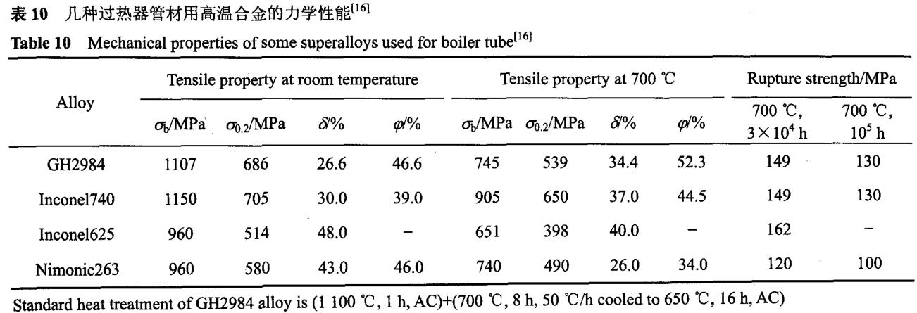 GH2984合金的室温至高温拉伸强度以及650~750℃持久强度非常良好,其室温和700℃拉伸强度明显高于常用高性能管材合金Inconel625和Nimonic263的,如表10所列[1]。其持久强度高于Nimonic263合金的,与Inconel625合金的相近。其3万小时和l0万小时的持久强度在700℃时与Inconel740合金的处于同一水平,而其在650和750℃时的持久强度也基本与Inconel625和Nimonic263合金的处于同一水平,如图6所示[13]。